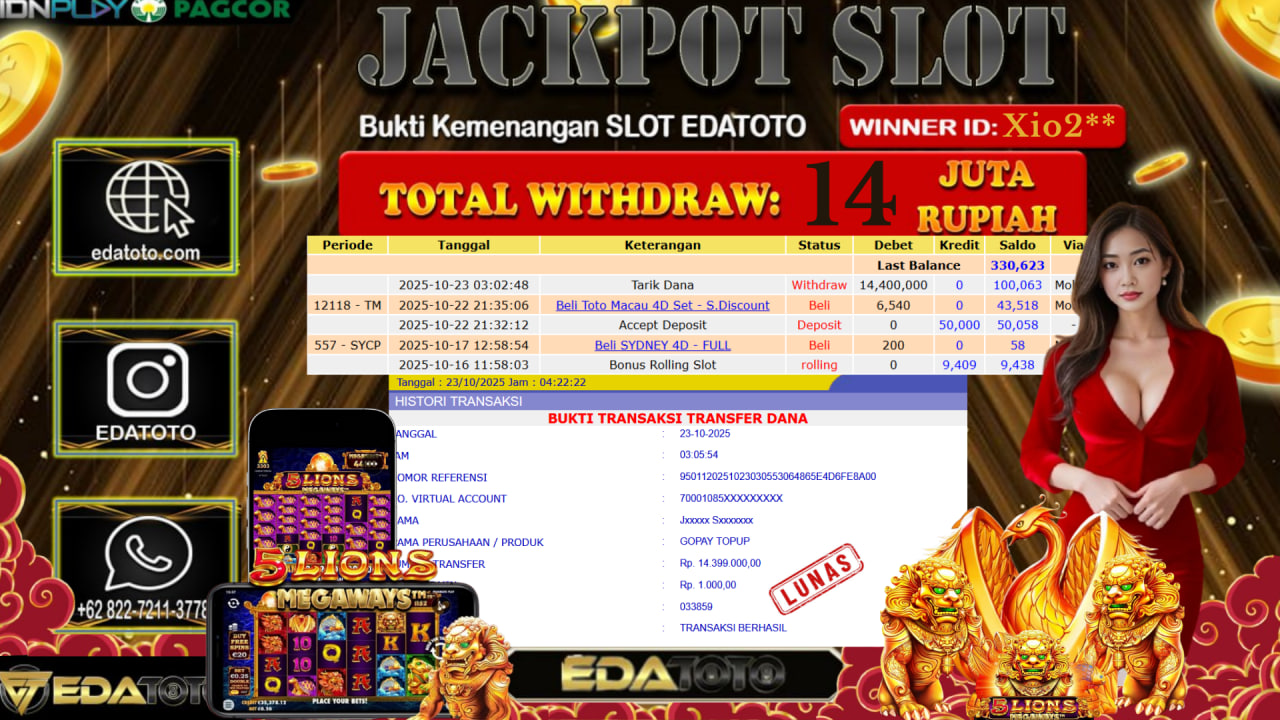 Selamat Kepada Pemilik user ID : Xio2** Hari/Tanggal : Kamis / 23, Oktober 2025 Jackpot : Rp. 14.400.000 JT Permainan . . .