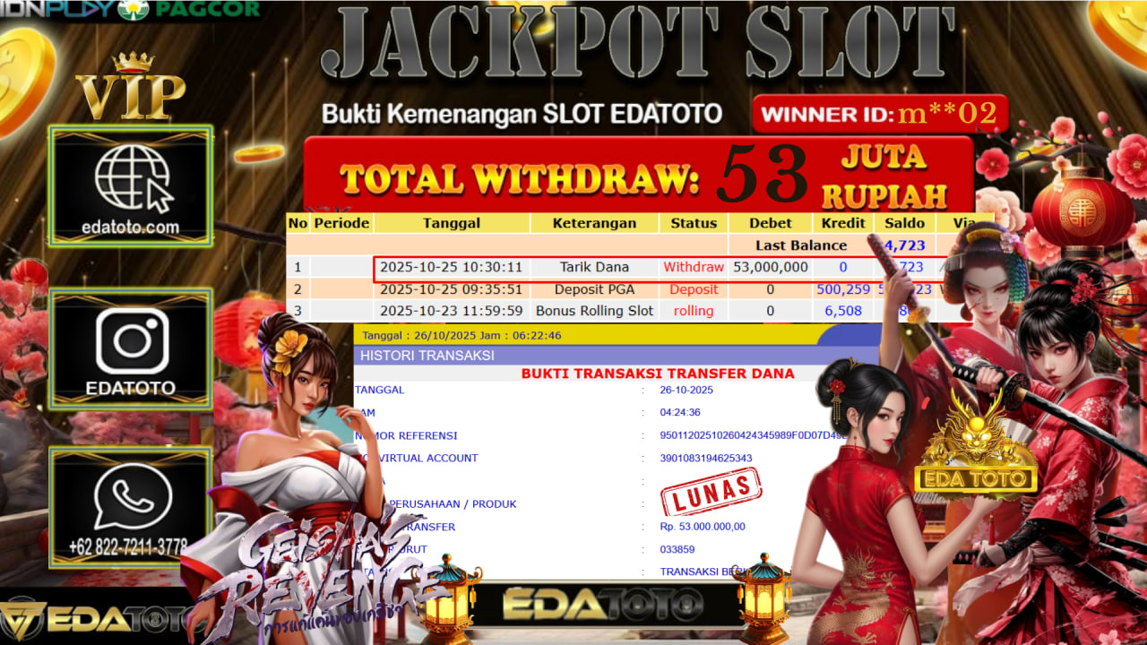 Selamat Kepada Pemilik user ID : m**02 Hari/Tanggal : Minggu / 26, Oktober 2025 Jackpot : Rp. 53.000.000 JT Permainan . . .