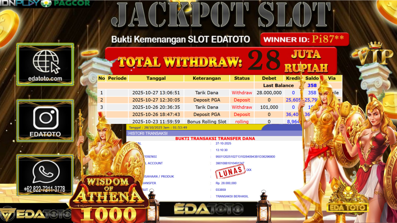 Selamat Kepada Pemilik user ID : Pi87** Hari/Tanggal : Senin / 27, Oktober 2025 Jackpot : Rp. 28.000.000 JT Permainan : Wisdom . . .