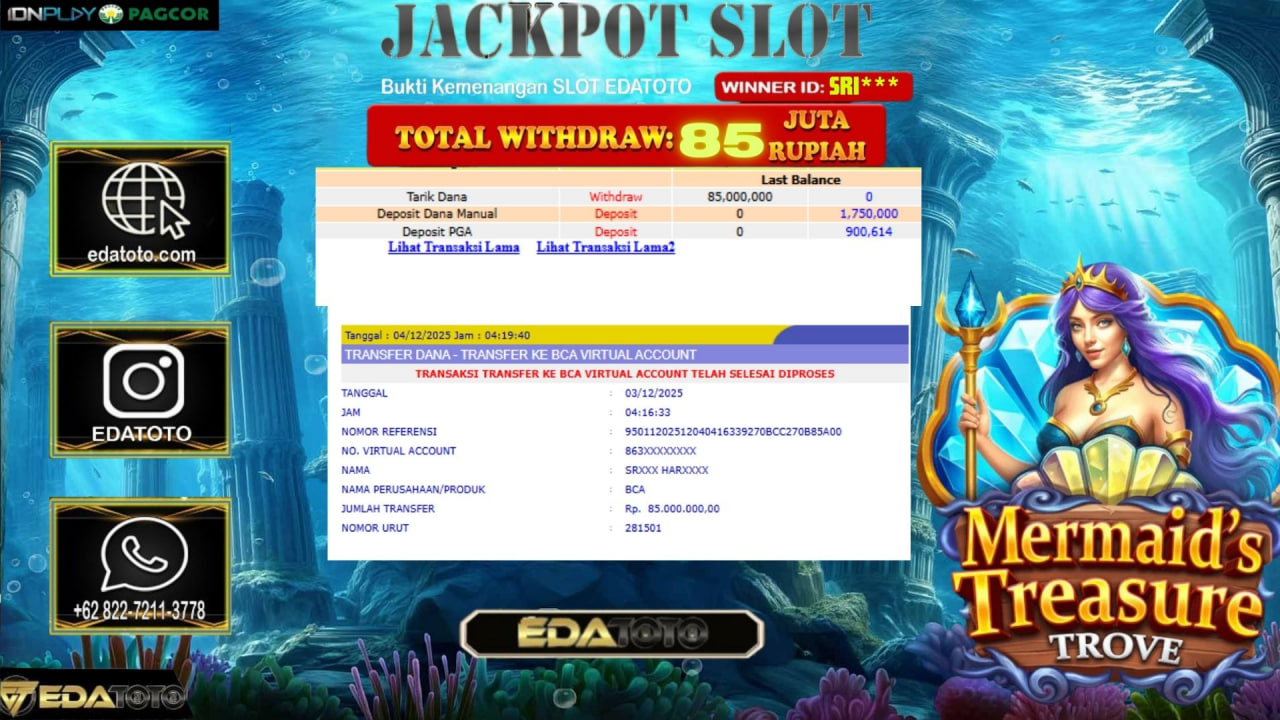 Selamat Kepada Pemilik user ID : SRI*** Hari/Tanggal :KAMIS / 3, DESEMBER 2025 Jackpot : Rp. 88,805,000 JT Withdraw :85,000,000 . . .