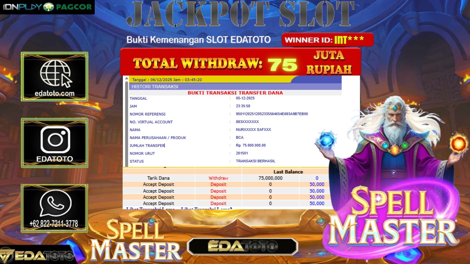 Selamat Kepada Pemilik user ID : INT*** Hari/Tanggal :JUMAT/ 5, Desember 2025 Jackpot : Rp. 84,500,000 JT Withdraw :75,000,000 JT . . .