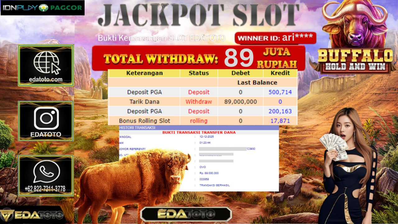 Selamat Kepada Pemilik user ID : ari**** Hari/Tanggal :kamis/ 12, Desember 2025 Jackpot : Rp. 89,000,000 JT Withdraw :89,000,000 JT . . .